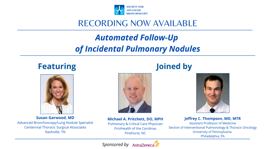 The Society for Advanced Bronchoscopy presents “Automated Follow-up of Incidental Pulmonary Nodules” featuring Dr Susan Garwood. She’s joined by Drs Michael Pritchett and Jeffrey Thompson. The program is sponsored by AstraZeneca.
