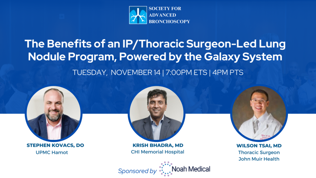 The Society for Advanced Bronchoscopy presents “The Benefits of an IP/Thoracic Surgeon-Led Lung Nodule Program, Powered by the Galaxy System ” with Drs. Kyle Hogarth, Krish Bhadra, & Wilson Tsai.