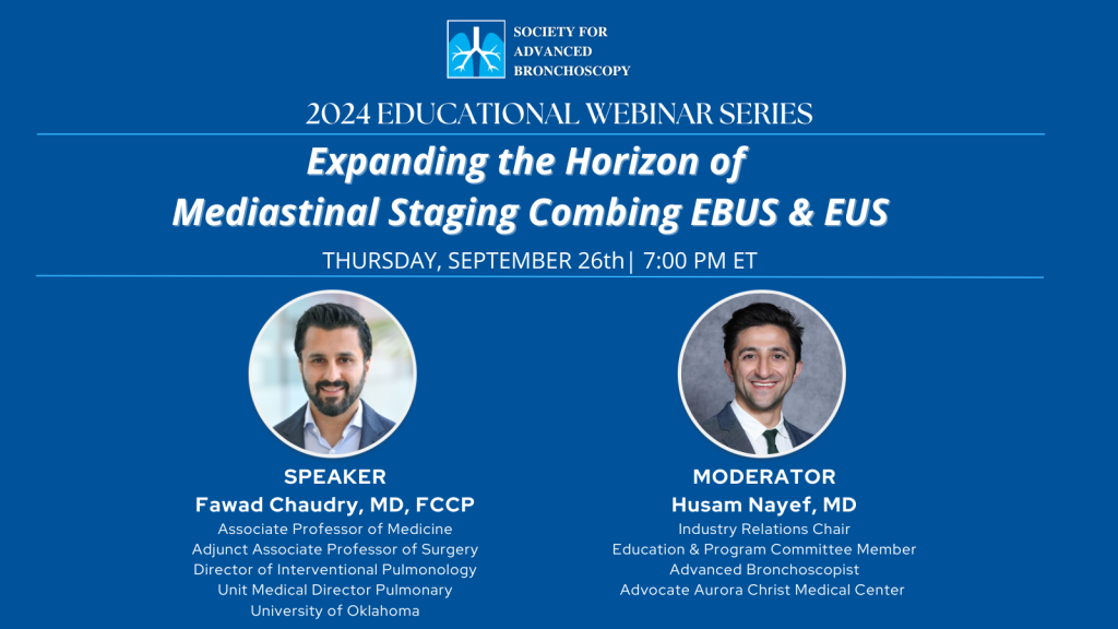 The Society for Advanced Bronchoscopy presents, “Expanding the Horizon of Mediastinal Staging Combing EBUS & EUS” with SAB Industry Relations Chair, Dr. Husam Nayef & guest speaker, Dr. Fawad Chaudry.