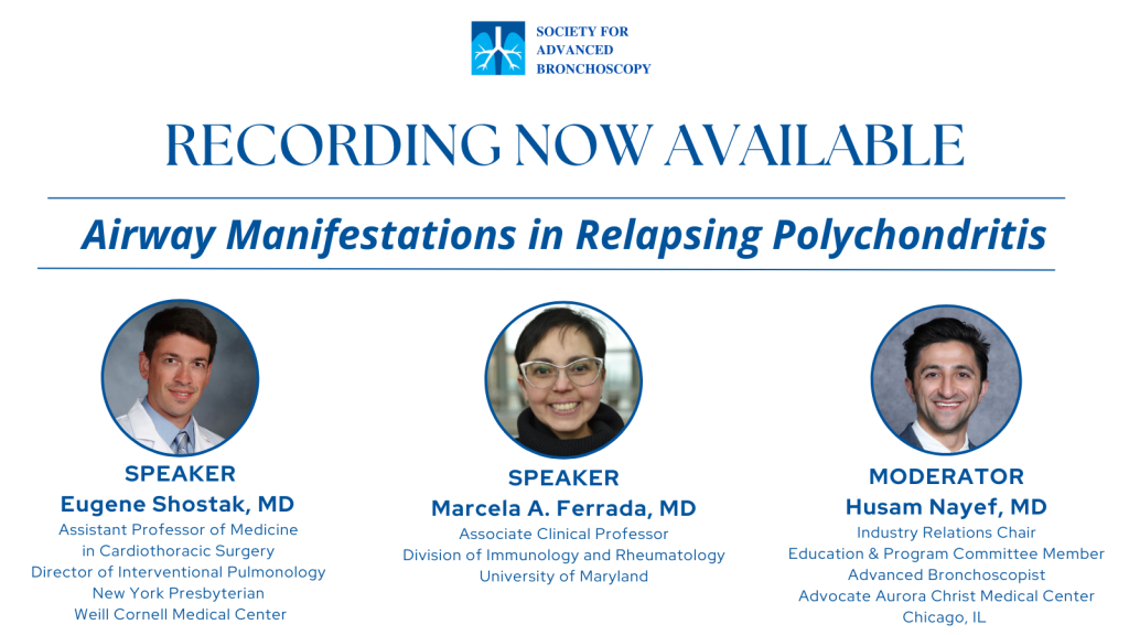 The Society for Advanced Bronchoscopy presents, “Airway Manifestations in Relapsing Polychondriti” with SAB Industry Relations Chair, Dr. Husam Nayef & guest speakers Drs Eugene Shostak & Marcela Ferrada.