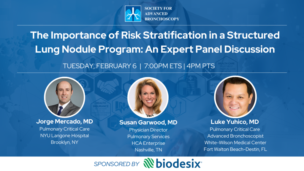 The Society for Advanced Bronchoscopy & Biodesix presents “The Importance of Risk Stratification in a Structed Lung Nodule Program: An Expert Panel Discussion” with Drs Jorge Mercado, Susan Garwood, & Luke Yuhico.