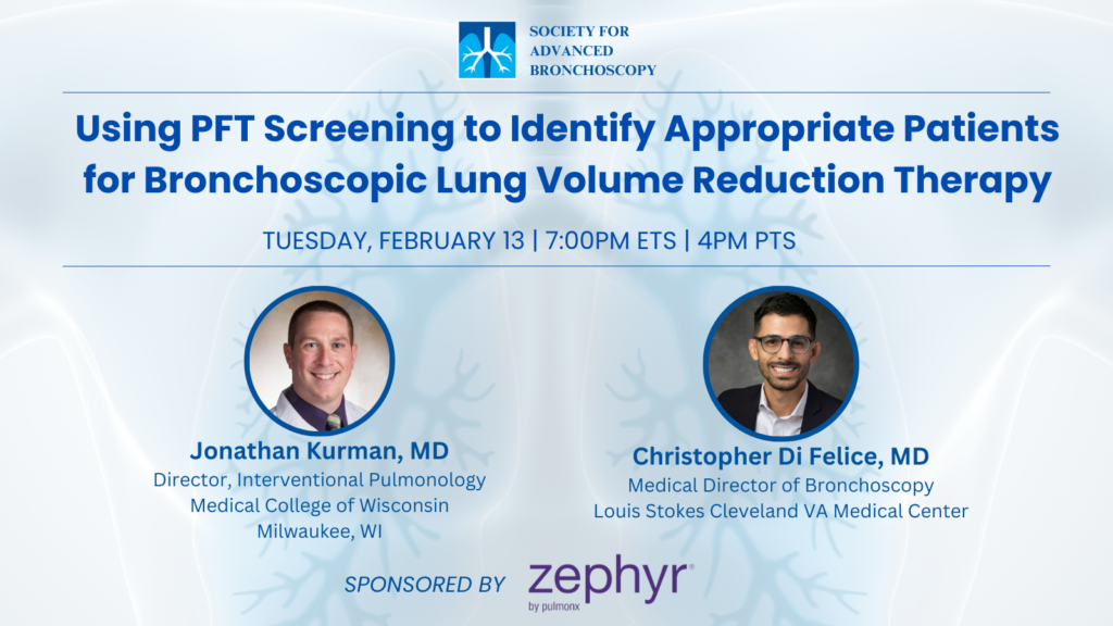 The Society for Advanced Bronchoscopy & Pulmonx presents “Using PFT Screening to Identify Appropriate Patients for Bronchoscopic Lung Volume Reduction Therapy” with Drs Johnathan Kurman, & Christopher Di Felice.
