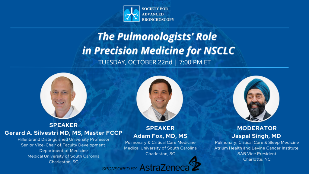 The Society for Advanced Bronchoscopy & AstraZeneca present “The Pulmonologists’ Role in Precision Medicine for NSCLC” with Drs Gerard Silvestri, Adam Fox, & Jaspal Singh.