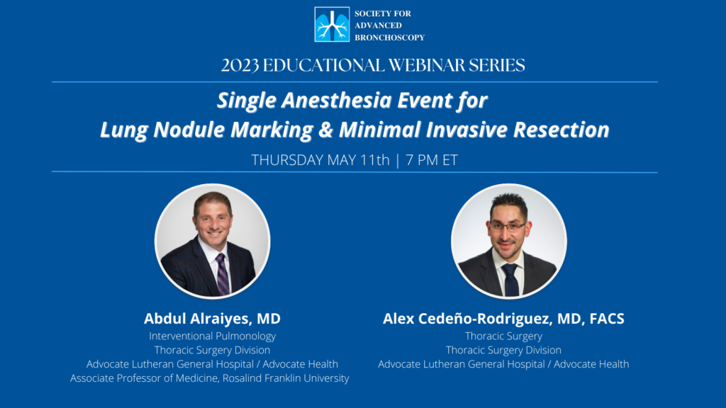 The Society for Advanced Bronchoscopy presents “Single Anesthesia Event for Lung Nodule Marking & Minimal Invasive Resection” featuring Drs. Abdul Hamid Alraiyes and Alex Cedeño-Rodriguez.