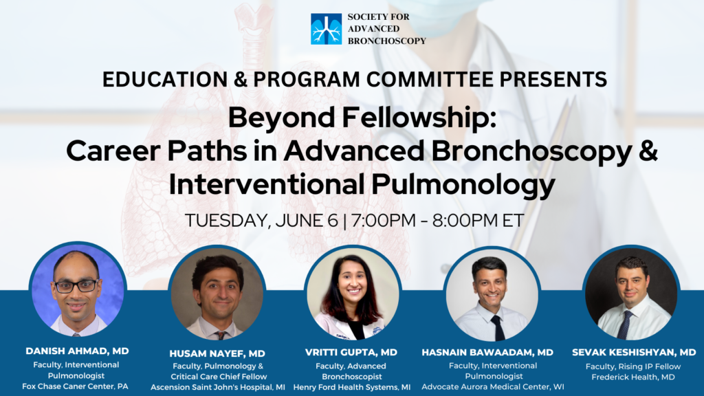 The Society for Advanced Bronchoscopy presents “Beyond Fellowship: Career Paths in Advanced Bronchoscopy & Interventional Pulmonology” featuring the SAB’s Education & Program Committee.