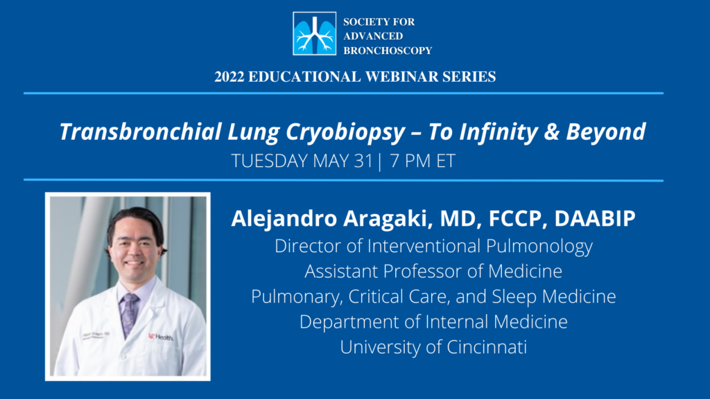 The Society for Advanced Bronchoscopy presents “Transbronchial Lung Cryobiopsy – To Infinity & Beyond” by Dr. Alejandro Aragaki.