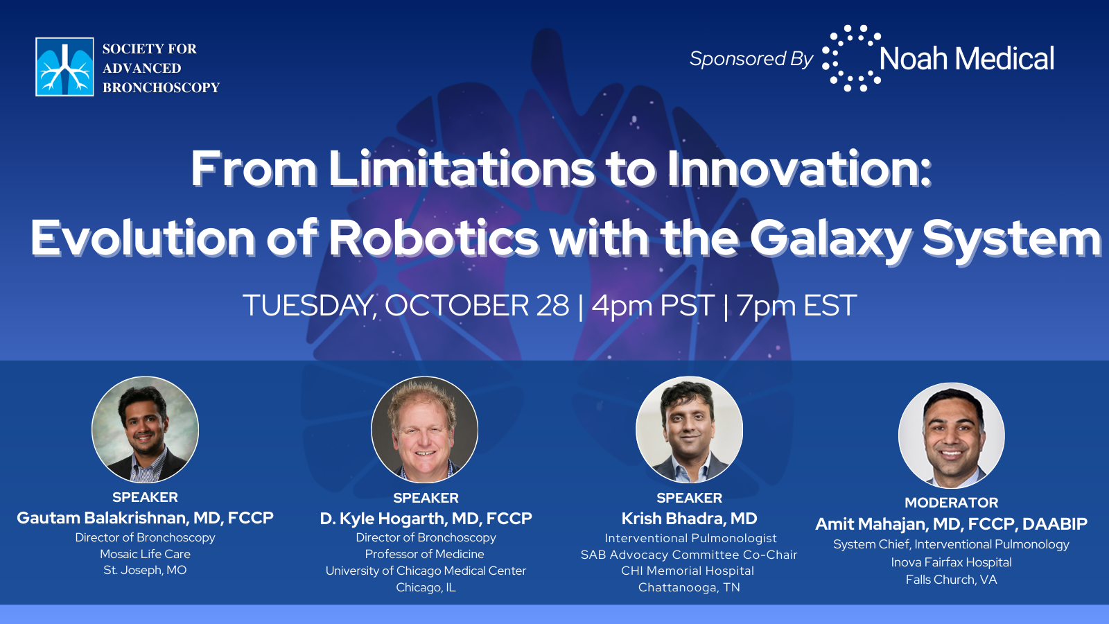 Join the SAB & Noah Medical on Tuesday, October 28th for “From Limitations to Innovation: Evolution of Robotics with the Galaxy System.” Hear from renowned clinical experts, Drs Guatman Balakrishnan, Kyle Hogarth, Krish Bhadra & Amit Mahajan as they explore the benefits of advanced imaging techniques in achieving higher diagnostic yield and procedural success. They will explain the importance it is to understand limitations across navigation platforms and how current solutions address these limitations through innovation. Lastly, they will discuss the clinical, operational and financial impact of robotic platforms in the field. There will be a Q&A portion at the end of the lecture.