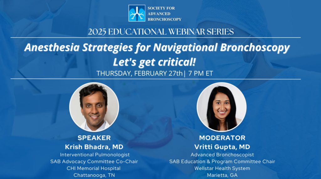 The Society for Advanced Bronchoscopy presents “Anesthesia Strategies for Navigational Bronchoscopy. Let’s get critical!” with Drs Krish Bhadra and Vritti Gupta.