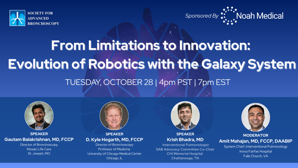 The Society for Advanced Bronchoscopy presents “From Limitations to Innovation: Evolution of Robotics with the Galaxy System” with Dr. Guatman Balakrishnan, Kyle Hogarth, Krish Bhadra & Amit Mahajan